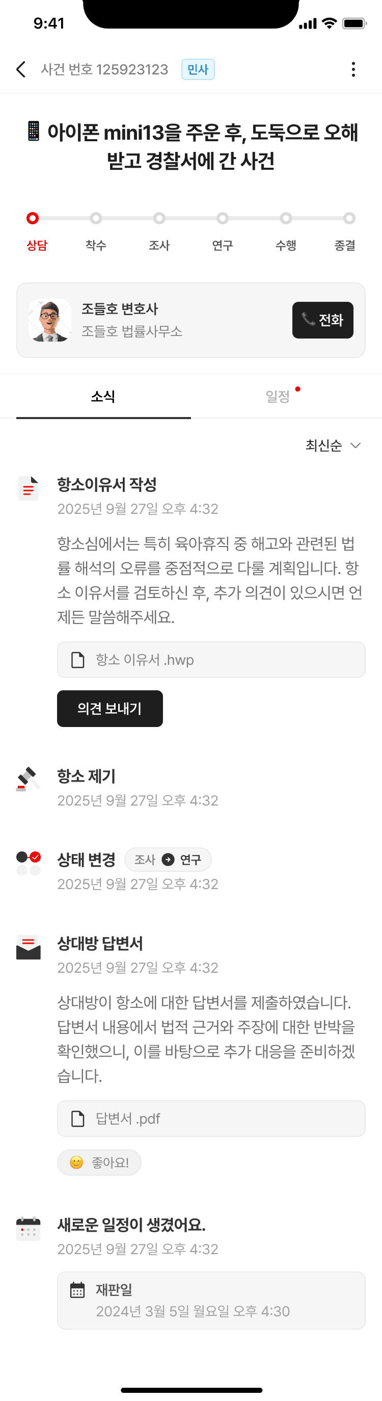 착수, 사실 정리, 법리 검토, 초안 작성, 수정 중, 제출 완료, 상대 서면 검토처럼