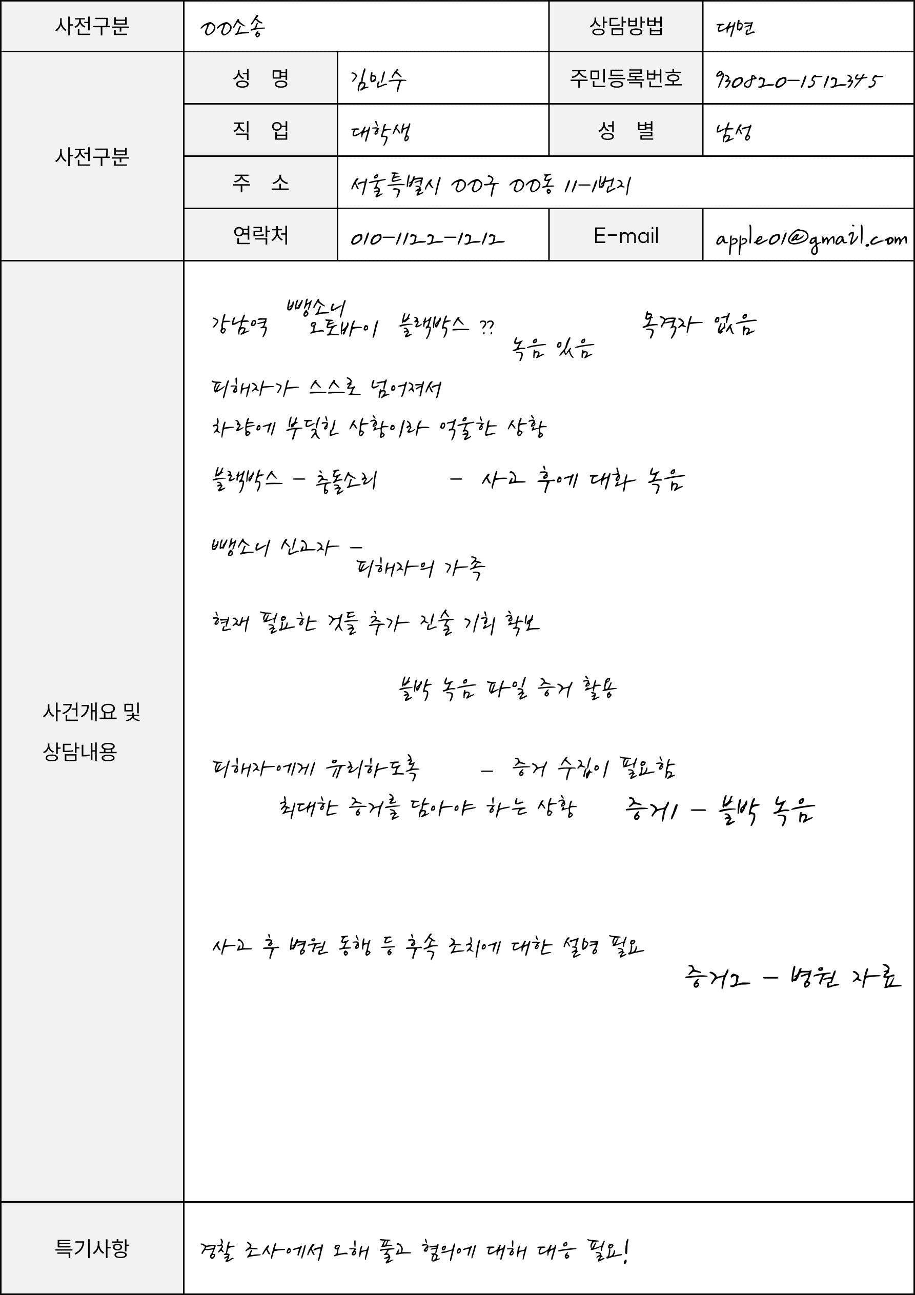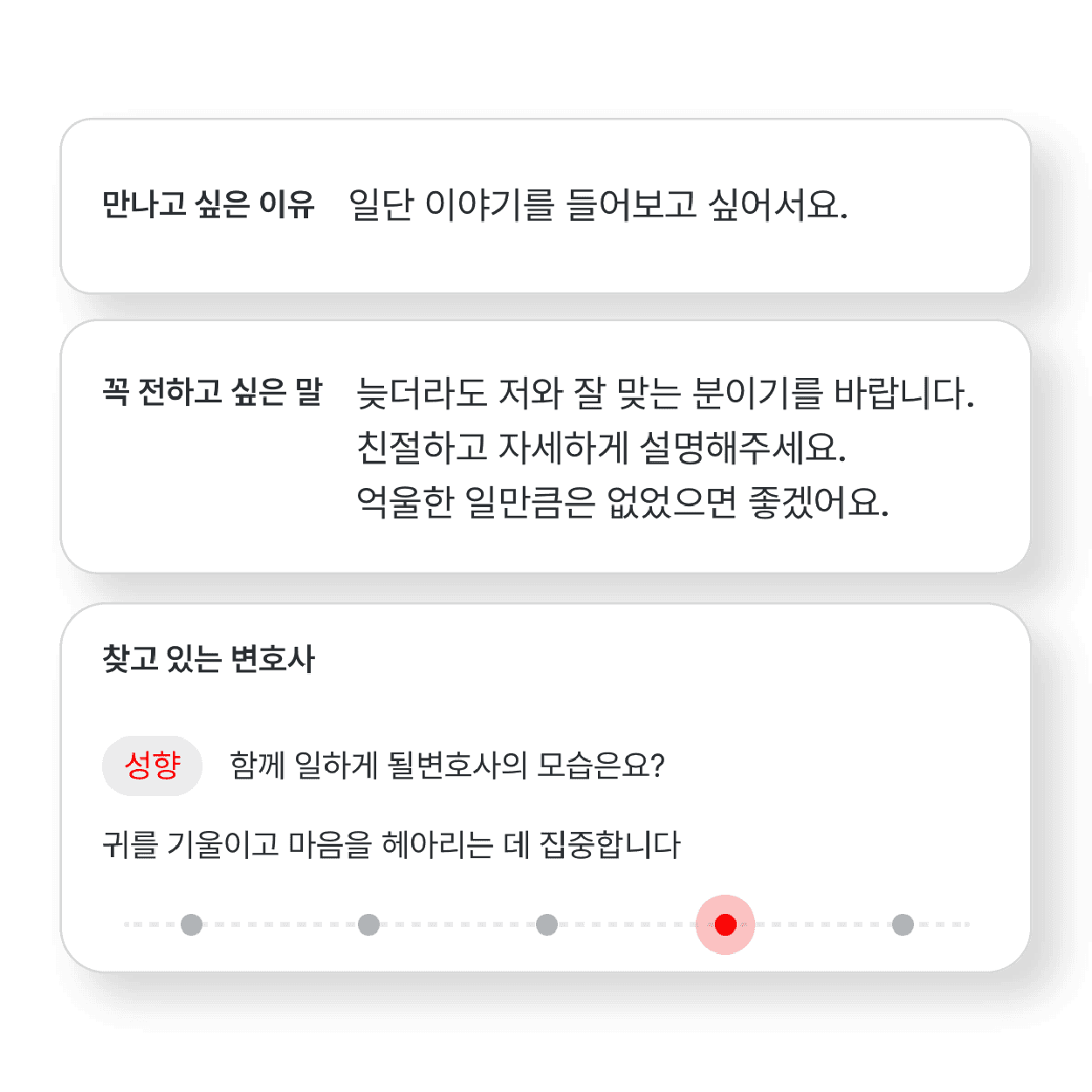 "뭐부터 해야될지조차 몰랐는데, 쓰고 나서 불안했던 마음이 많이 가라앉았습니다. 변호사 님과의 상담도 수월했어요. 에이브 몰랐으면 어땠을까 싶어요."