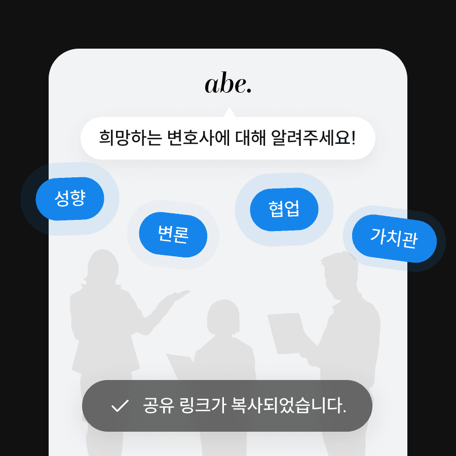 변호사를 만나보기로 마음 먹었다면, 내 주장을 뒷받침할만한 자료는 충분히 가지고 있는지, 마음가짐은 어떠한지, 누구와 함께 어려움을 이겨내 나갈 것인지 스스로 먼저 점검해보세요. 어울리는 짝을 만나기 위한 첫번째 준비도 나의 리걸 라이프 파트너 에이브.와 함께
